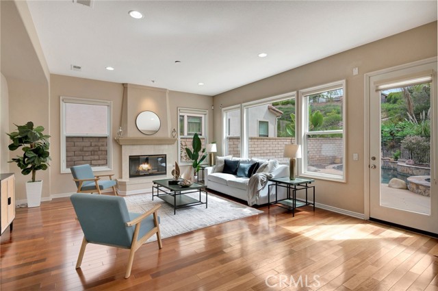 The exquisite residence features a gated front courtyard adorned with a stone water feature, creating a serene entrance. Upon entering, one is greeted by an inlaid marble medallion in the foyer and an elegant circular wrought-iron staircase. The living room showcases stunning Brazilian cherry wood flooring that seamlessly transitions into the formal dining area. French doors open to a Zen Garden, providing exceptional privacy thanks to its beautifully landscaped hillside to the south. The expansive kitchen boasts granite countertops, stainless steel appliances, a walk-in pantry, and ample storage space. The professionally landscaped yard features a solar-heated pebble tech saltwater pool and spa, complemented by a built-in fire ring with bench seating. Additionally, there is an outdoor BBQ station complete with a refrigerator and an arbor that provides both shade and ambient lighting. This remarkable backyard serves as an ideal retreat for social gatherings or simply enjoying nature. Conveniently located on the ground floor is a guest suite alongside a powder room. The primary bedroom is situated at the rear of the home, offering tranquil views over the backyard. Its bathroom exudes luxury with features such as a jacuzzi tub, separate sinks, and vanity spaceenhanced by an expansive step-in double shower equipped with multiple massage jets. Large private windows allow natural light to flood this inviting space. Adjacent to the primary bedroom are double door entries leading into its own walk-in closet. Furthermore, two additional bedrooms along with bathrooms are located ups